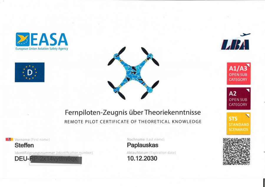 Unsere Mitarbeiter mit A1, A2 & STS 02 Drihnenflugschein sind auf alle Vorschriften Vorbereitet.
